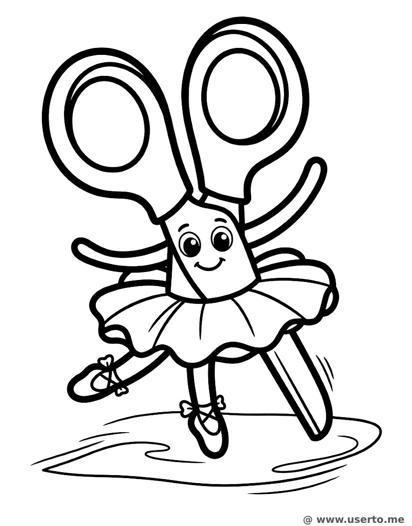 Uma tesoura de segurança usando um tutu e sapatilhas de balé, dançando sobre uma folha de papel.