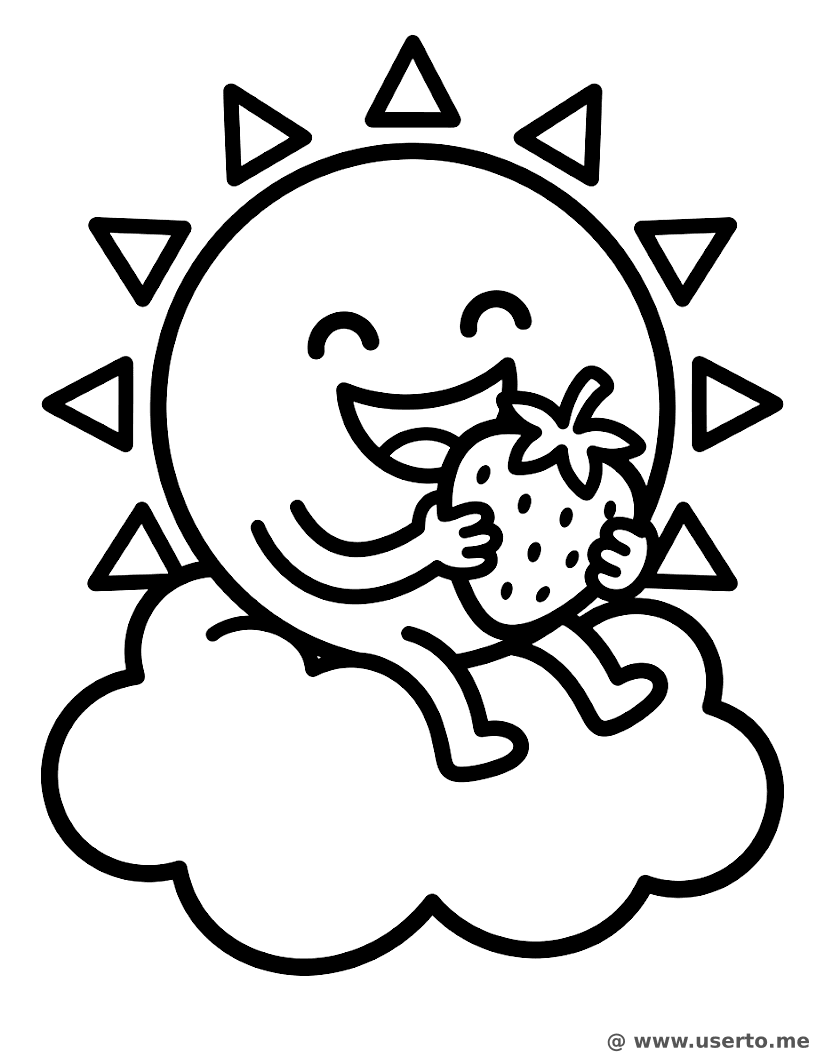 Um sol alegre senta-se numa nuvem fofinha, comendo alegremente um morango gigante e suculento.