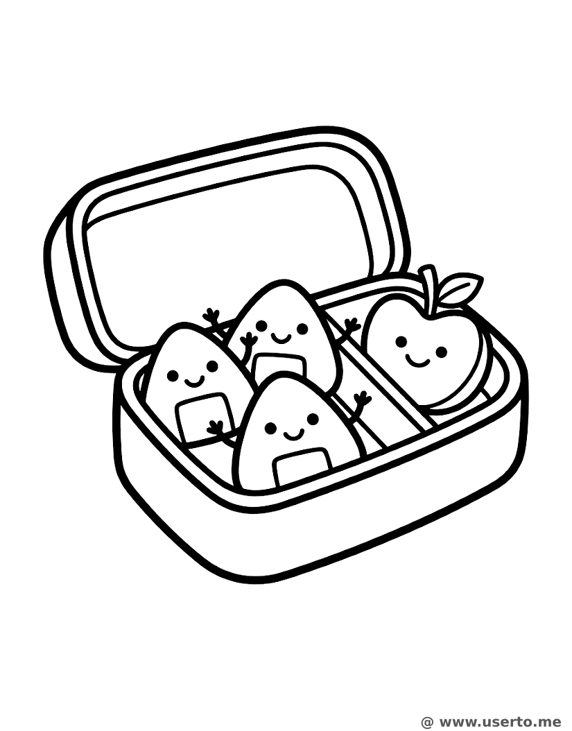 Uma lancheira feliz com bolinhos de arroz sorridentes acenando para uma fatia de maçã amigável.