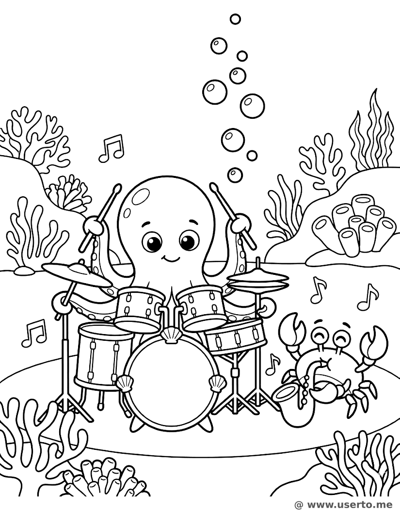 Um polvo baterista e um caranguejo saxofonista se apresentando em um palco subaquático borbulhante.