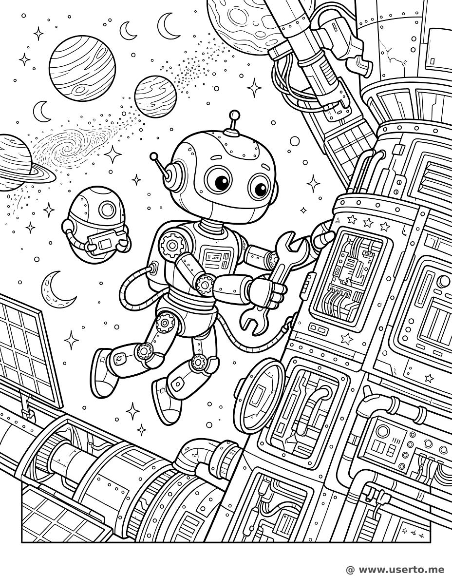 Robô Consertando a Estação Espacial - AI Coloring Book: To Me Grátis