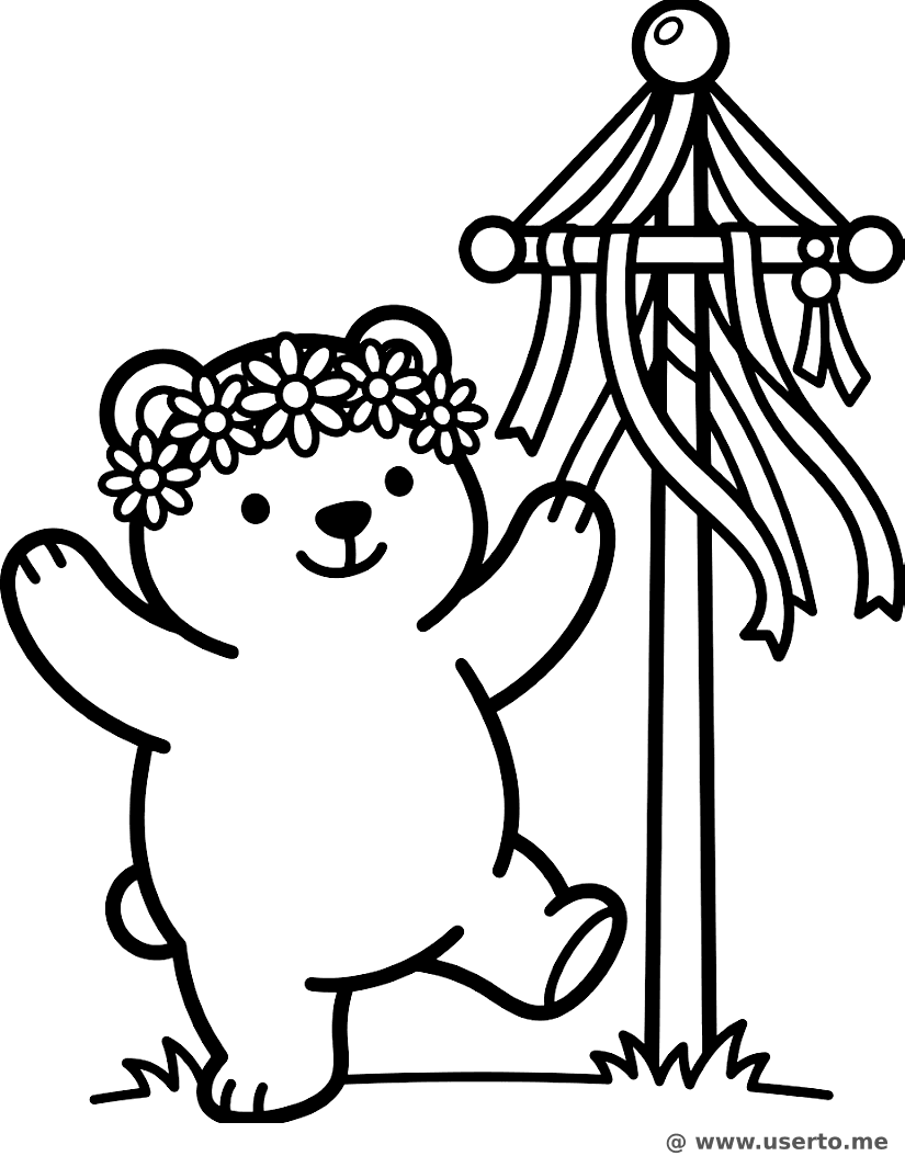 Um urso feliz usando uma coroa de flores e dançando em volta de um mastro decorado.