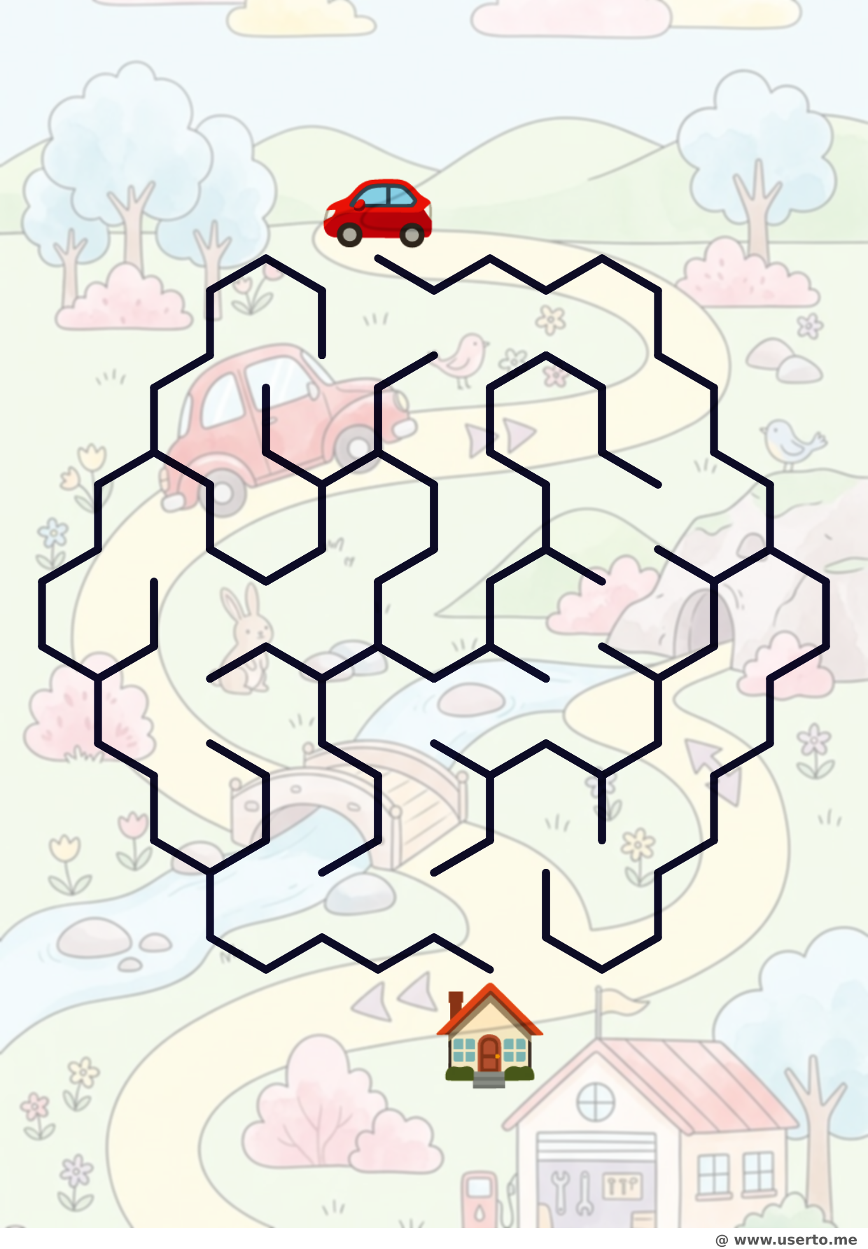 Ajude o carro vermelho a encontrar o caminho de volta para sua garagem aconchegante através de um caminho simples.