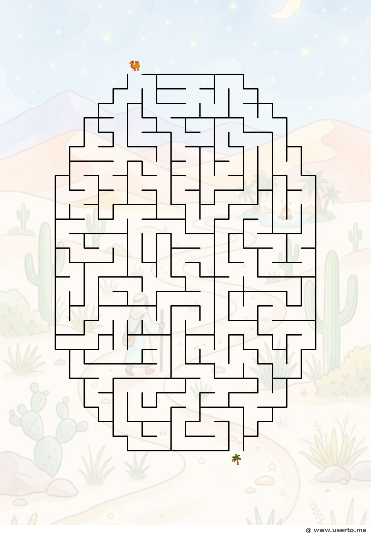 Prepare-se com enorme entusiasmo para o sensacional desafio divertidíssimo com o lindo quebra-cabeça de esplêndido labirinto O Caminho Estrelado do Nômade do Deserto, que é uma incrível e formidável atividade valiosa imprimível brilhantemente em nossa esplêndida e vasta coleção excelente. Apresentando criativos designs de empolgantes desierto, estrelas, tesselação, geométrico, oásis, circle, tem um maravilhoso belíssimo formato imaculado incrível, facilitando a rápida impressão deslumbrante na dimensão padronizada excelente do tamanho adorável de notável folha limpa de excelente papel A4. Rastrear e percorrer rapidamente do início incrível até o fim mágico treina cérebro maravilhoso perfeitamente e de bom grado.