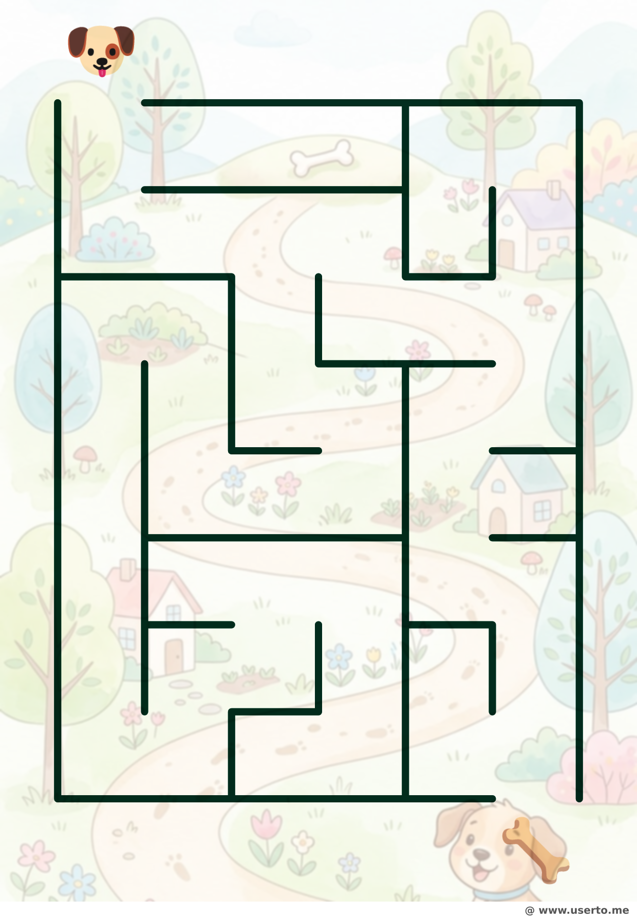 Um labirinto muito fácil e corto com linhas grossas ajudando um cachorrinho a encontrar seu petisco favorito.