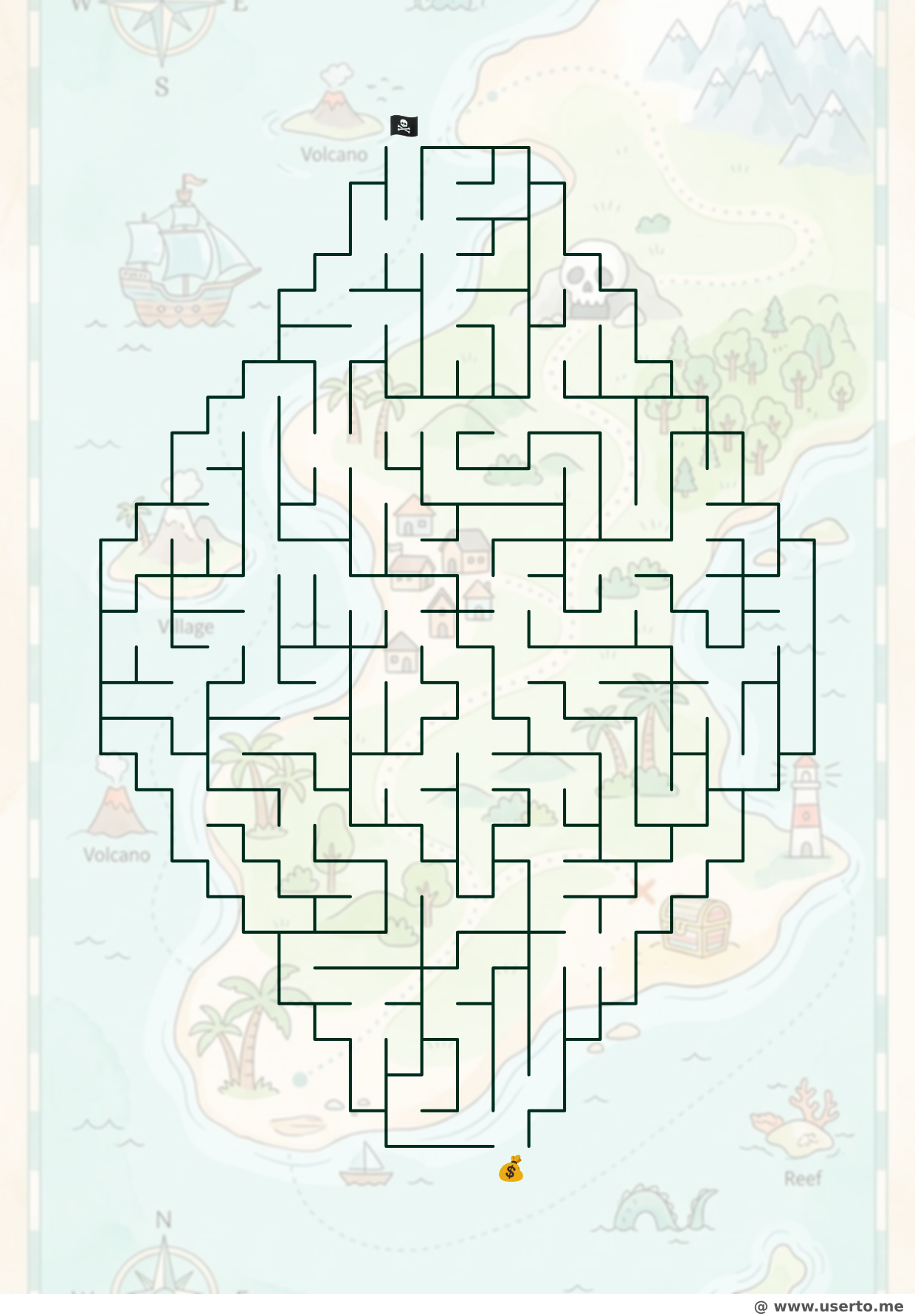 Um labirinto complexo na ilha com muitas voltas e reviravoltas para levar o pirata ao baú de ouro escondido.
